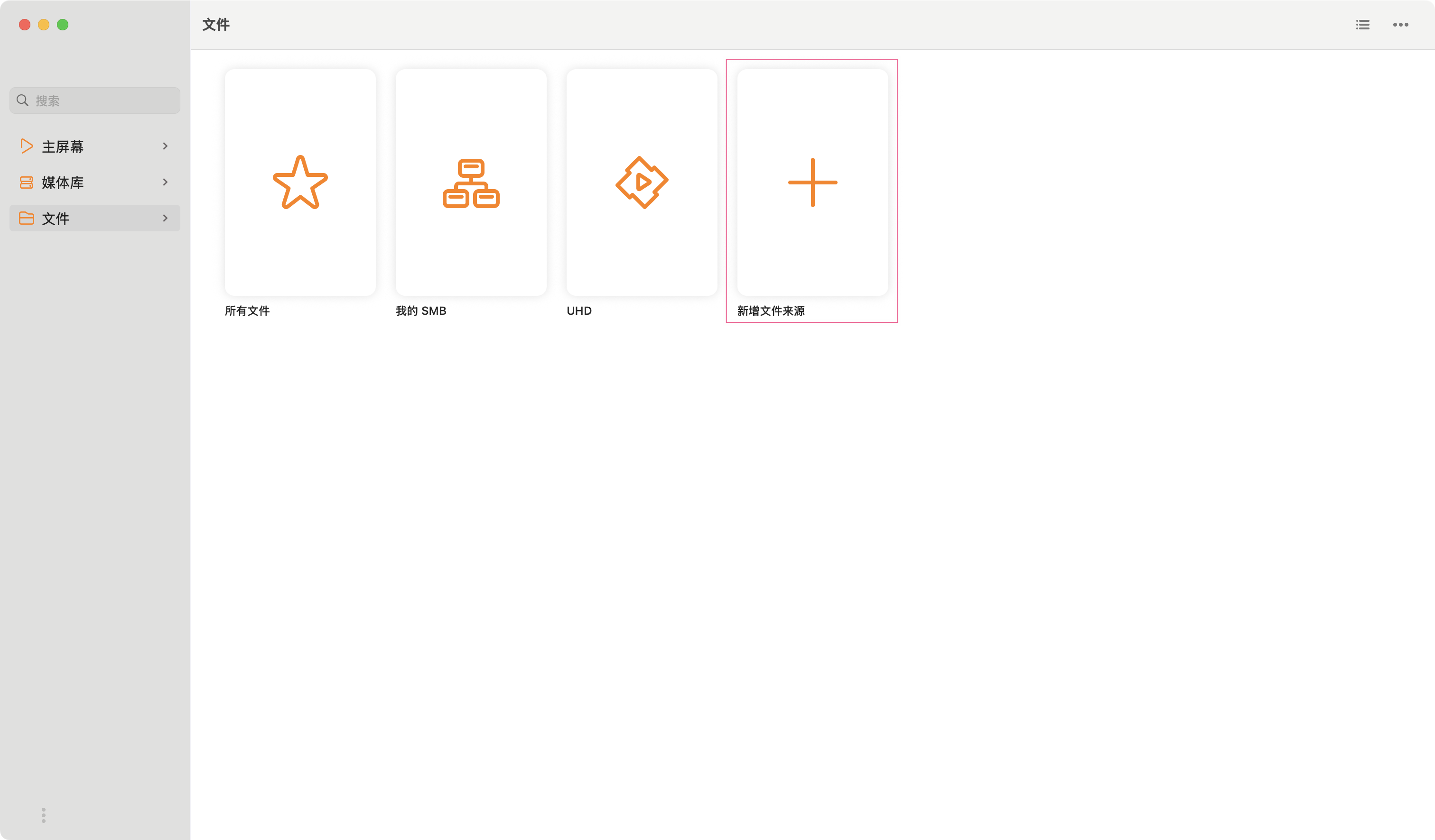 在主界面「文件」-> 「新增文件来源」,选择 “添加文件” 或 “添加共享”。