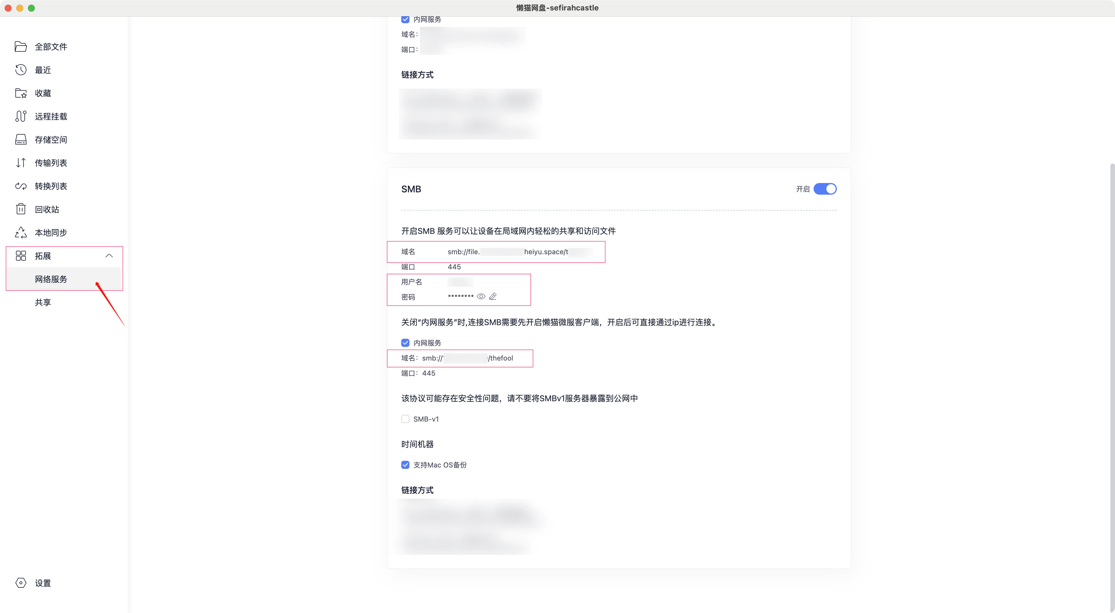 找到「扩展」-> 「网络服务」-> SMB,你会看到系统为你生成好的专属连接信息。