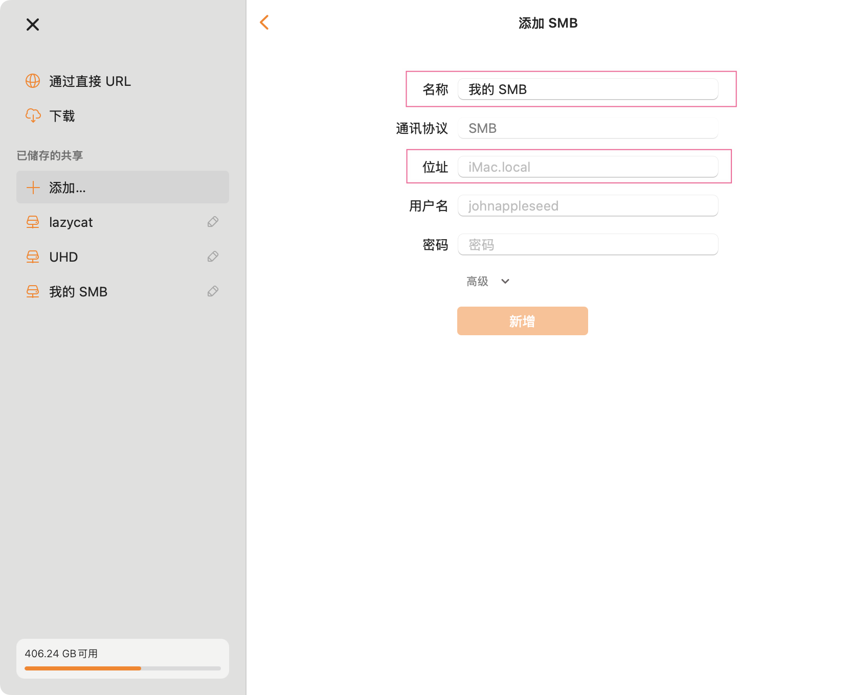 - 名称: 可以随意填写,方便自己识别即可,例如 “我的懒猫影院”。